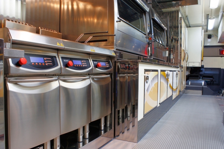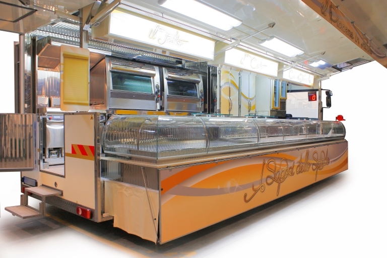 Internal equipment with: sink, gas tanks compartment, power generator, half heated and half refrigerated sales counter with oleodynamic movement, refrigerated cabinets, frozen cabinet, extraction hood, 1 rotisserie for 126 chickens, 1 single tank fryer.