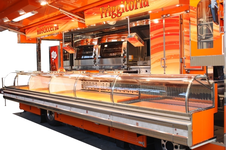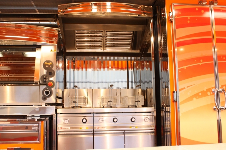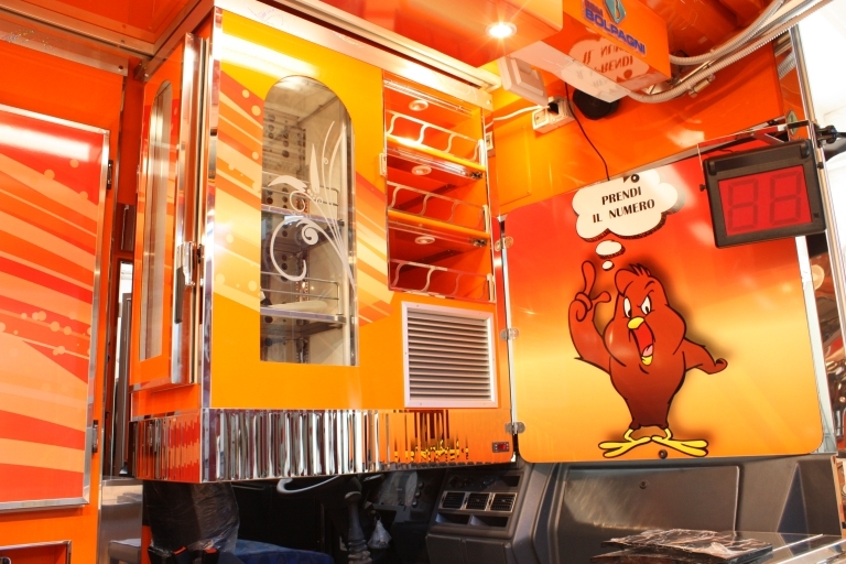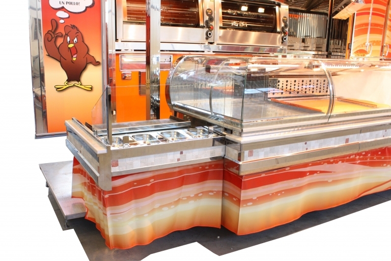 Internal equipment with: sink, gas tanks compartment, power generator, half heated and half refrigerated sales counter with hydraulic movement, refrigerated cabinets, frozen cabinet, extraction hood, 2 rotisseries, 1 single tank fryer, 1 double tank fryer, 1 fry-top.