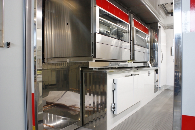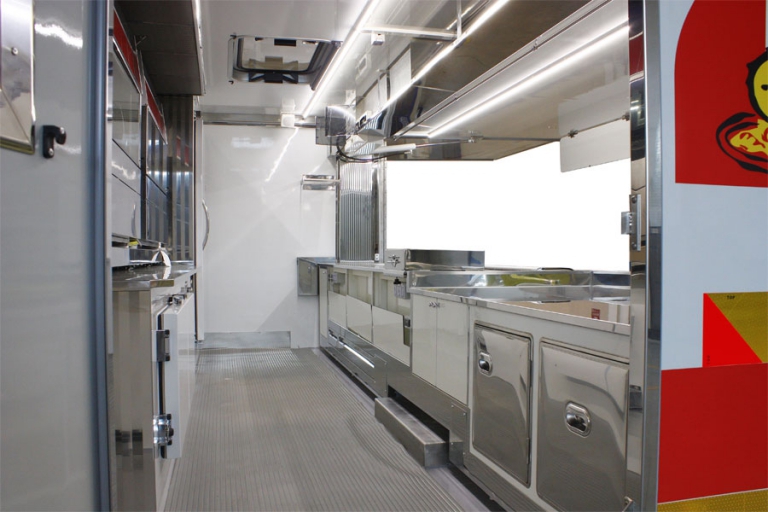 Equipamiento interno con: lavabo, compartimiento para tanques GLP, generador eléctrico, banco de venta mitad refrigerado y mitad calentado, cámara refrigerada, congelador, campana de aspiración, 2 asadores por 126 pollos, 1 freidora a doble tanque, 1 fry-top y 1 cocedor de pasta.