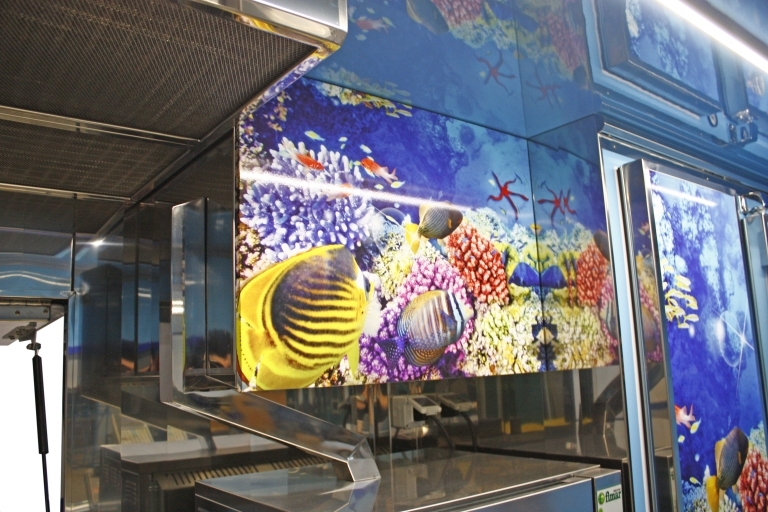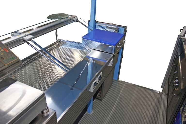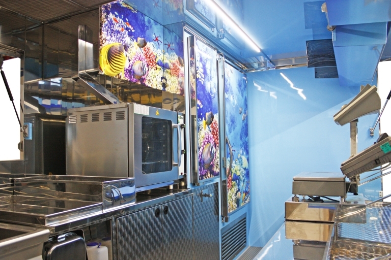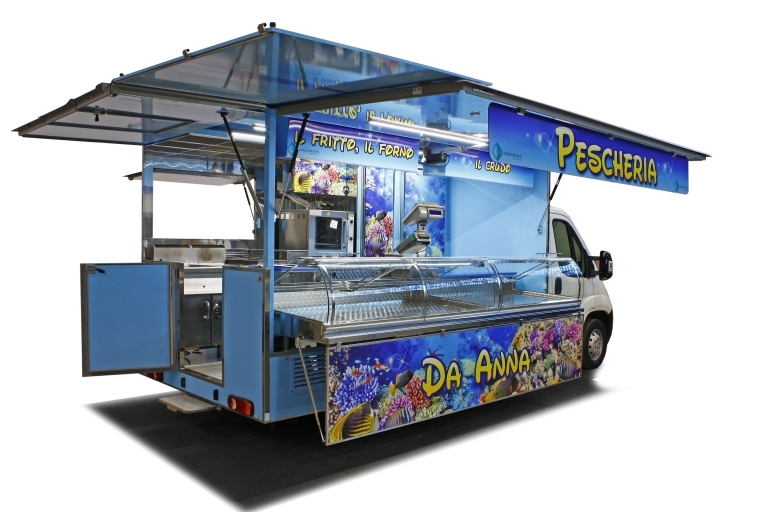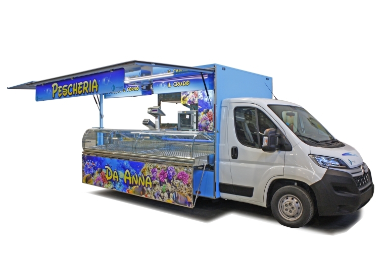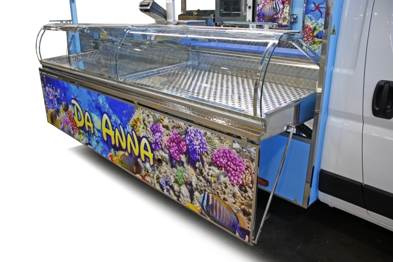 Realización camión tienda con cabina de 3,5 toneladas utilizado como pescadería.