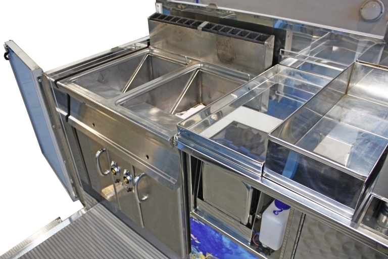 Equipamiento interno con: lavabo, compartimiento para tanques GLP, banco de venta mitad refrigerado y mitad calentado, cámara refrigerada, congelador, campana de aspiración, 1 freidora a doble tanque, 1 horno.