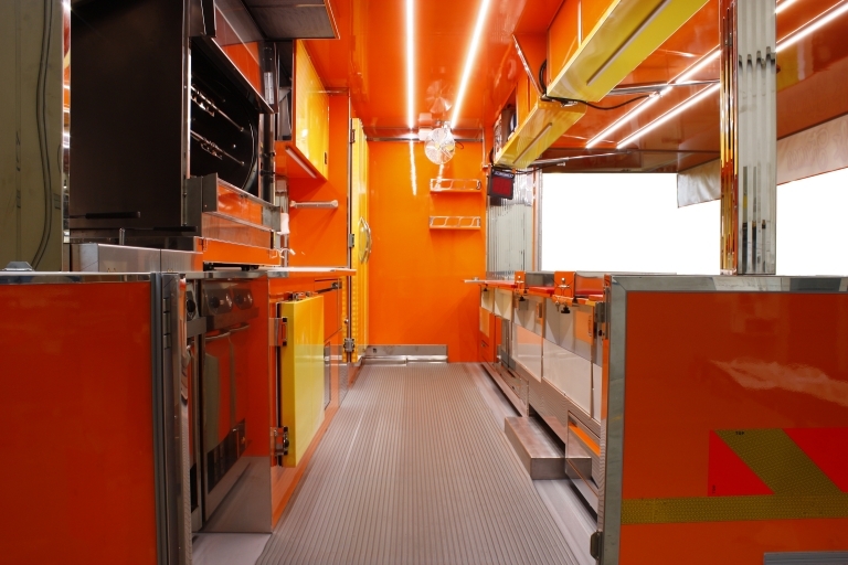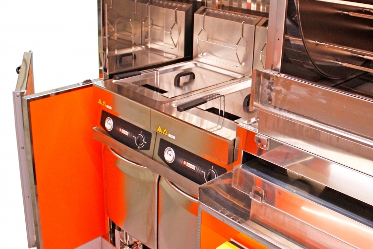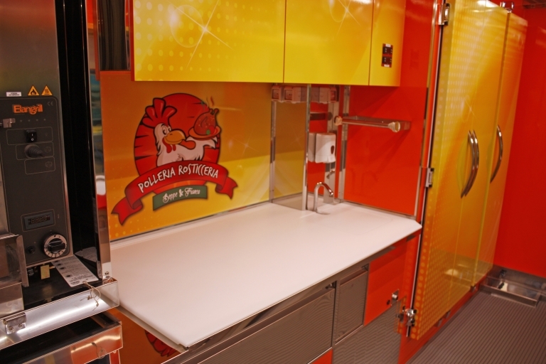 Equipamiento interno con: lavabo, compartimiento para tanques GLP, generador eléctrico, banco de venta mitad refrigerado y mitad calentado, cámaras refrigeradas, congelador, campana de aspiración, 1 asador por 126 pollos, 2 freidoras a un tanque.