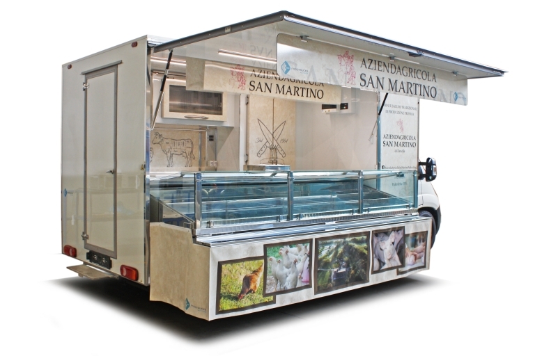 Realización camión tienda con cabina de 3,5 toneladas utilizado por la venta de productos alimentarios.