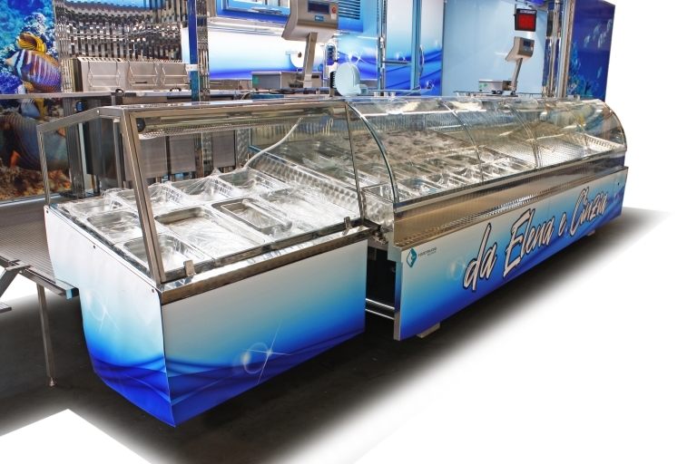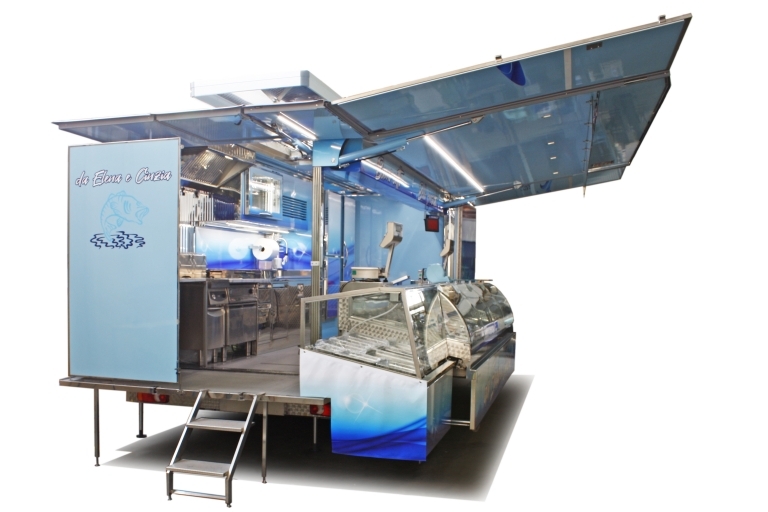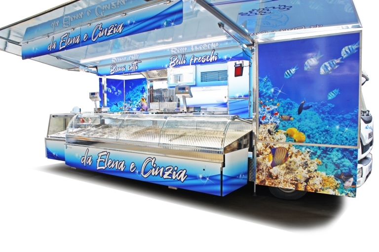 Realización camión tienda con cabina de 12 toneladas utilizado como pescadería.