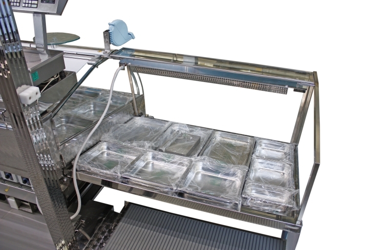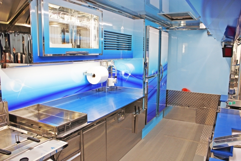Equipamiento interno con: lavabo, compartimiento para tanques GLP, generador eléctrico, banco de venta mitad calentado y mitad refrigerado, cámaras refrigeradas, congelador, campana de aspiración, 1 freidora a doble tanque y 1 freidora a un tanque.