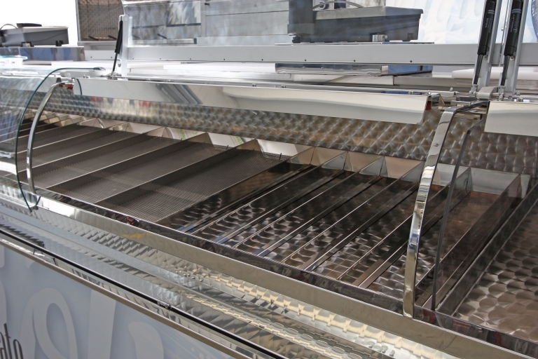 Vitrina extraíble hidráulica para la venta de productos alimenticios, completa con cubeta de exposición y encimera revestida de acero inoxidable.