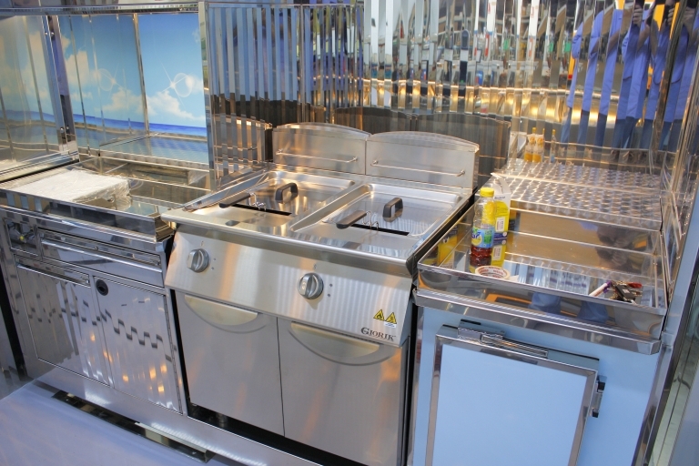 Equipamiento interno con: lavabo, compartimiento para tanques GLP, generador eléctrico, banco de venta mitad refrigerado y mitad calentado, cámaras refrigeradas, congelador, campana de aspiración, 1 freidora a doble tanque.