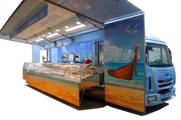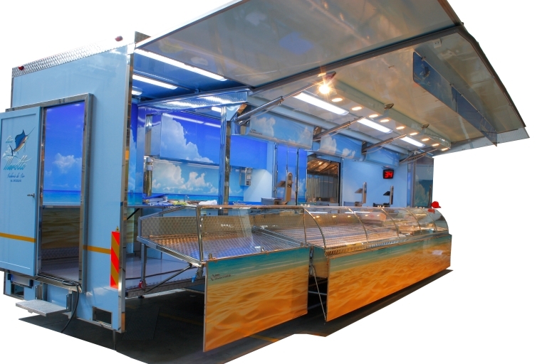 Realización camión tienda con cabina de 12 toneladas utilizado como pescadería por pescado crudo y cocido.