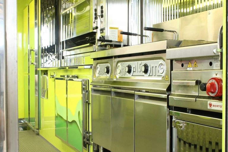 Equipamiento interno con: lavabo, compartimiento para tanques GLP, generador eléctrico, banco de venta mitad refrigerado y mitad calentado, banco satélite refrigerado, cámaras refrigeradas, congelador, campana de aspiración, 1 freidora a doble tanque y 1 freidora a un tanque, 1 fry-top y 1 asador por 84 pollos.
