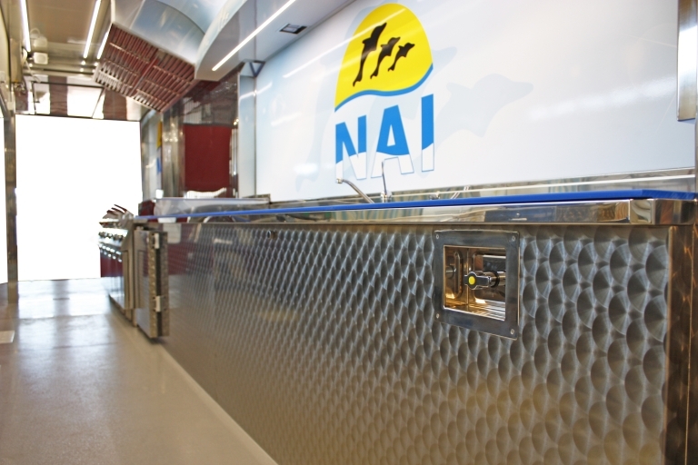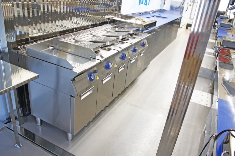 Equipamiento interno con: lavabo, compartimiento para tanques GLP, generador eléctrico, banco de venta mitad refrigerado y mitad calentado, cámaras refrigeradas, congelador, campana de aspiración, 4 freidoras a un tanque, 1 fry-top.