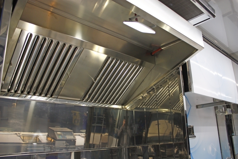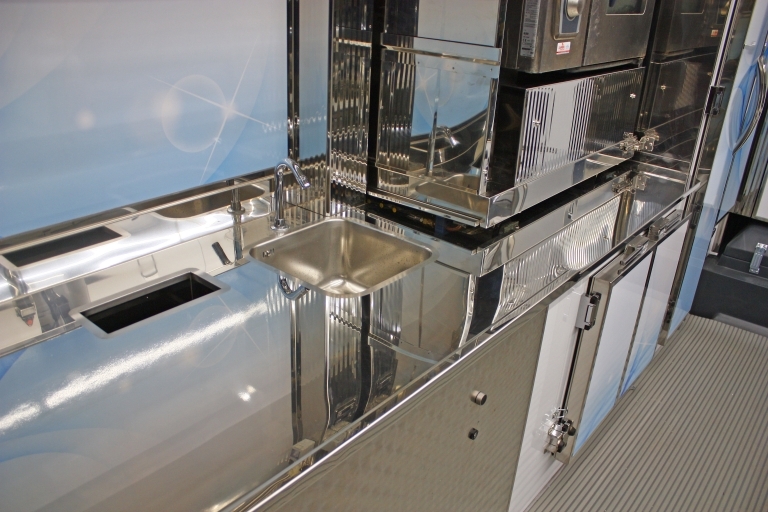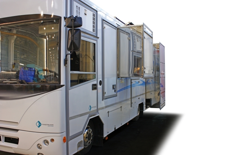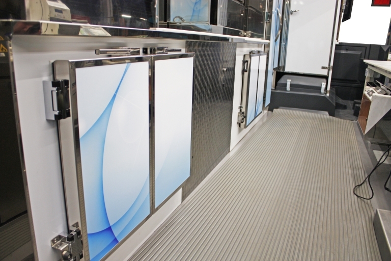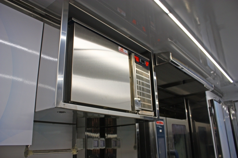 Equipamiento interno con: lavabo, compartimiento para tanques GLP, banco de venta mitad refrigerado y mitad calentado, cámaras refrigeradas, congelador, campana de aspiración, 3 freidoras a un tanque, 1 horno y 1 abatidor.