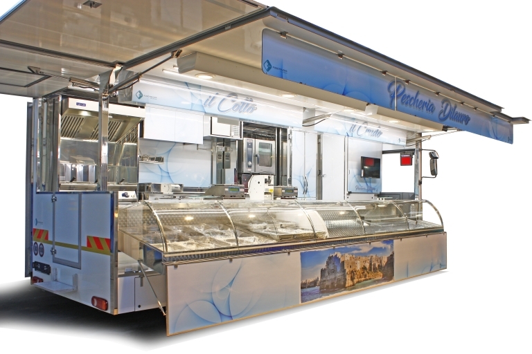 Realización camión tienda integral de 10 toneladas utilizado como pescadería por pescado crudo y cocido.