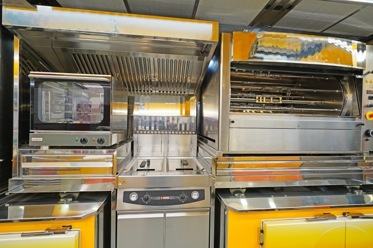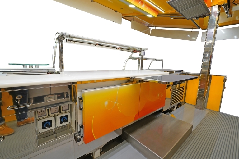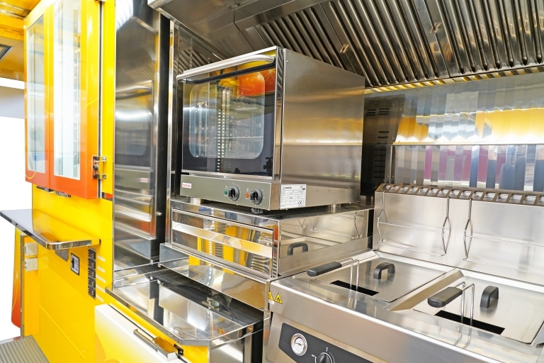 Equipamiento interno con: lavabo, compartimiento para tanques GLP, generador eléctrico, banco de venta calentado y refrigerado, cámaras refrigeradas, congelador, campana de aspiración, 1 asador, 1 freidora a doble tanque, 1 fry-top, 1 horno.