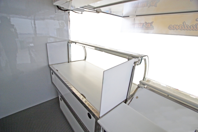 Aménagement intérieur avec: évier, générateur électrique, banc de vente réfrigéré, chambre réfrigérée, urne pour la porchetta.