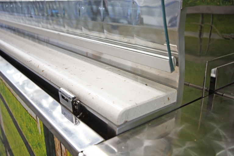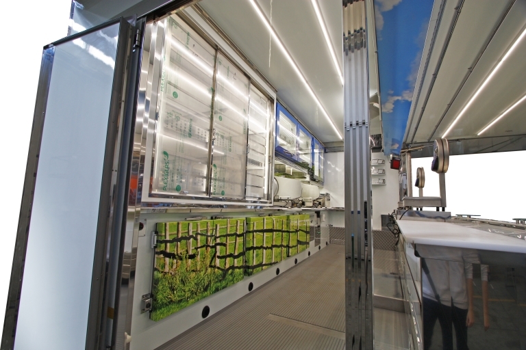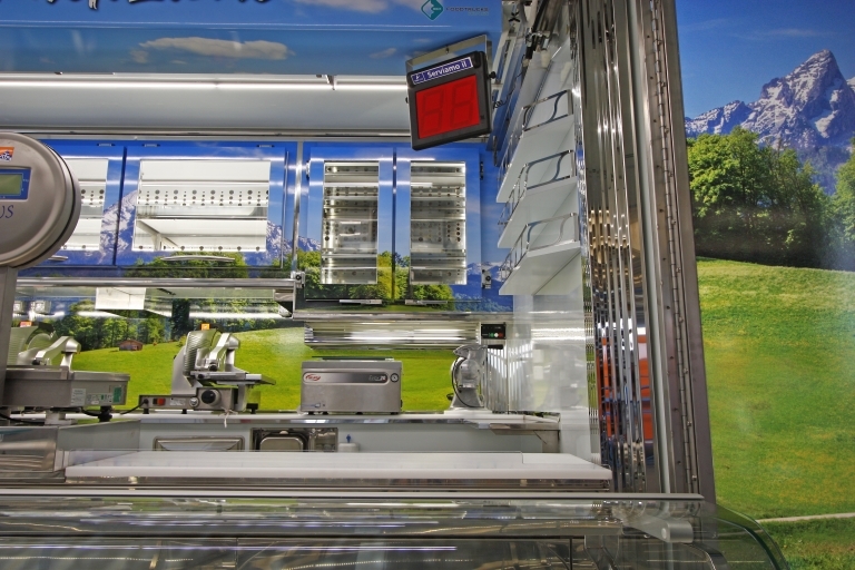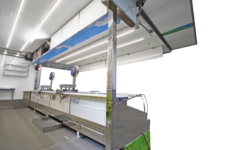 Réalisation camion magasin chassis-cabine de 12 tonnes utilisé pour la vente de charcuterie et des fromages.