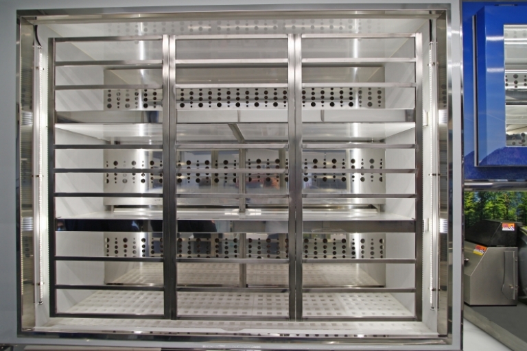 Aménagement intérieur avec: évier, générateur électrique, banc de vente réfrigéré, chambres réfrigérées.