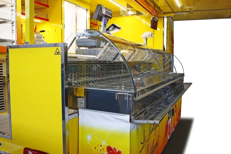 Réalisation camion magasin chassis-cabine de 3,5 tonnes utilisé pour la vente de produits alimentaires.