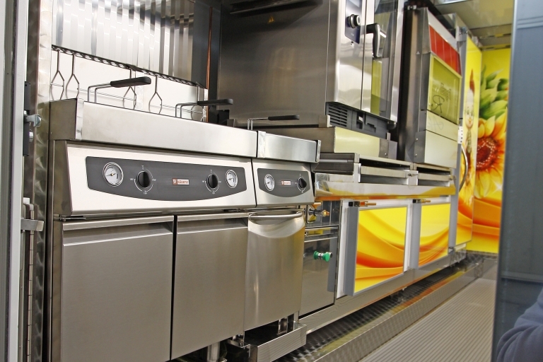 Aménagement intérieur avec: évier, compartiment pour bouteilles GPL, hotte d'aspiration, banc de vente chauffé, chambres réfrigérées, congélateur, 1 rôtisserie, 1 friteuse à 2 bacs, 1 friteuse à 1 bac et 1 four.