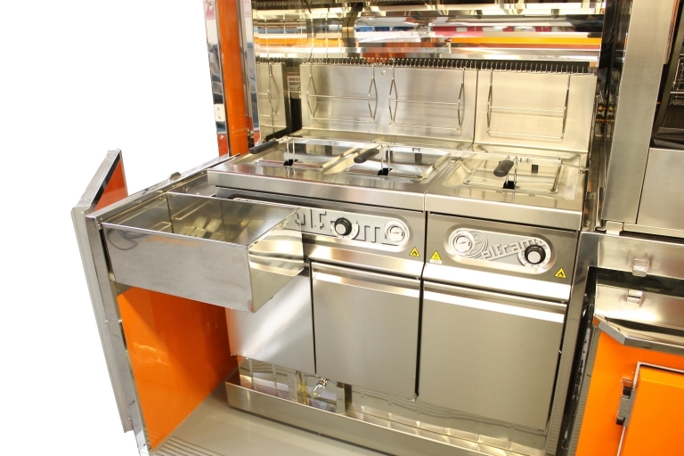 Aménagement intérieur avec: évier, compartiment pour bouteilles GPL, hotte d'aspiration, banc de vente moitié réfrigéré et moitié chauffé, chambres réfrigérées, congélateur, 1 rôtisserie pour 126 poulets, 1 friteuse à 2 bacs, 1 friteuse à 1 bac, 1 four.
