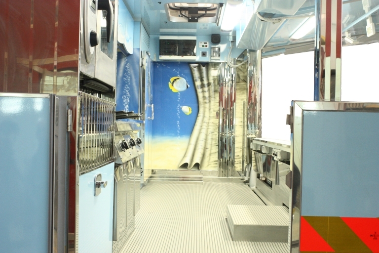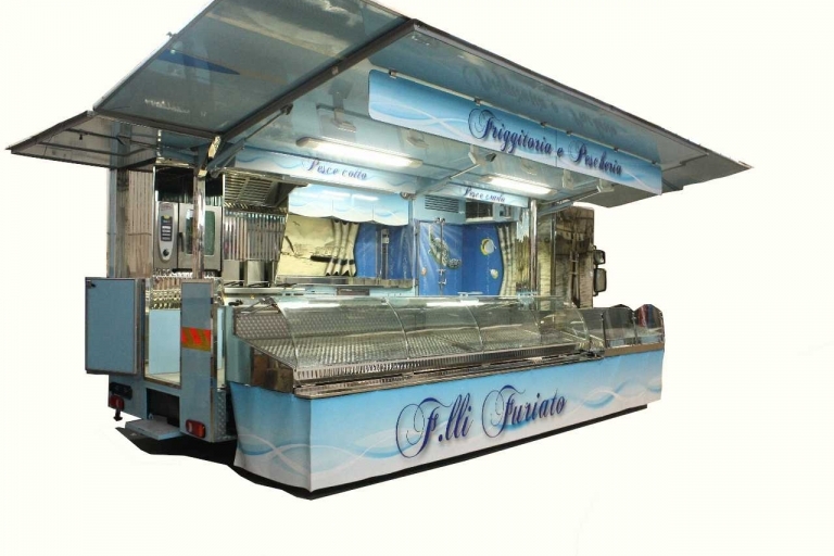 Aménagement intérieur avec: évier, compartiment pour bouteilles GPL, générateur électrique, hotte d'aspiration, banc de vente moitié réfrigéré et moitié chauffé, banc satellite réfrigéré, chambres réfrigérées, congélateur, 3 friteuses à 1 bac, 1 four.