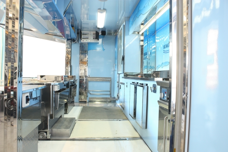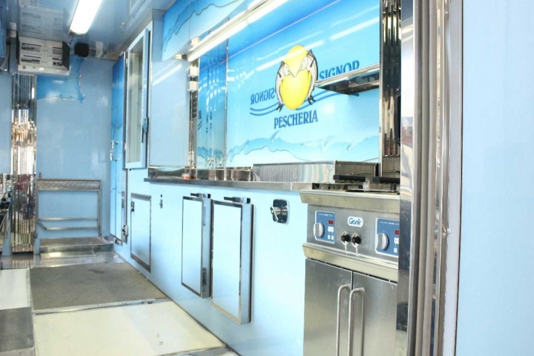 Aménagement intérieur avec: évier, compartiment pour bouteilles GPL, générateur électrique, hotte d'aspiration, banc de vente réfrigéré, banc satellite réfrigéré, chambres réfrigérées, congélateur, 1 friteuse à 1 bac.