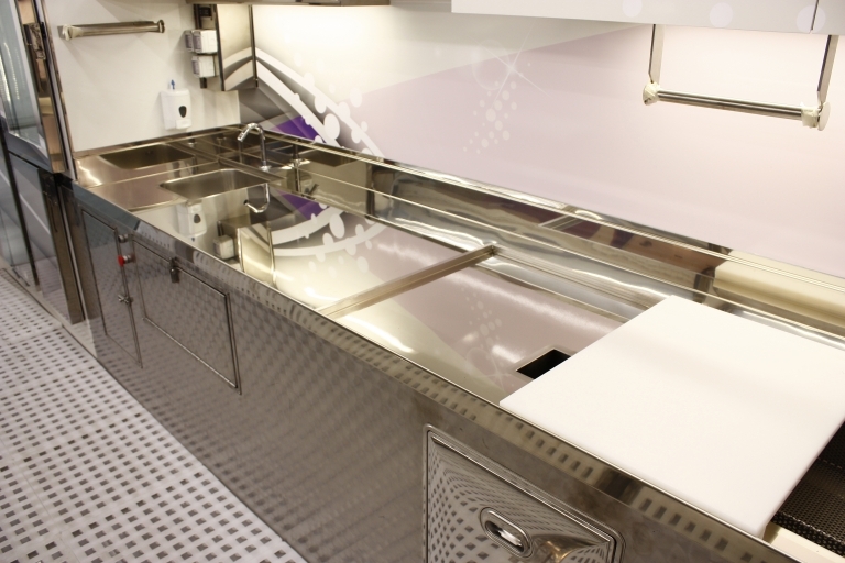 Aménagement intérieur avec: évier, banc de vente réfrigéré, chambres réfrigérées.