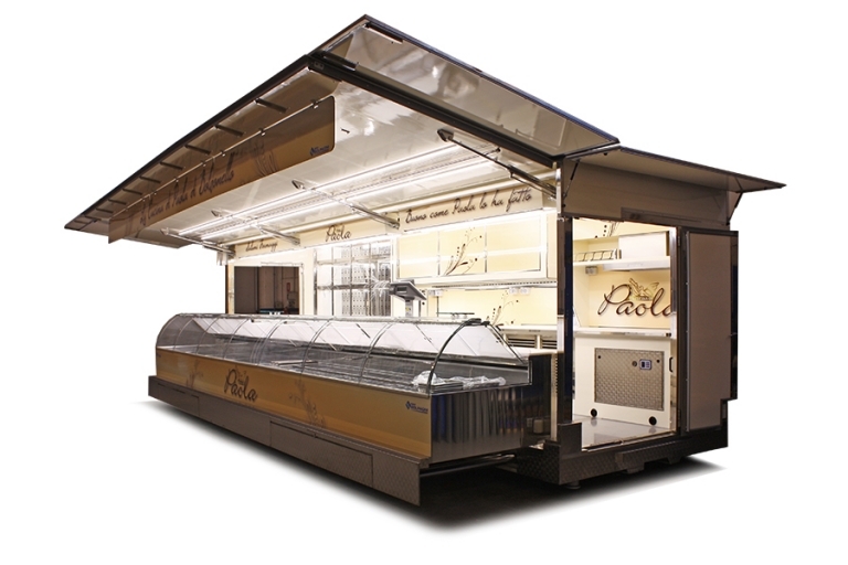 Réalisation camion magasin extensible license C utilisé pour la vente de charcuterie et des fromages.