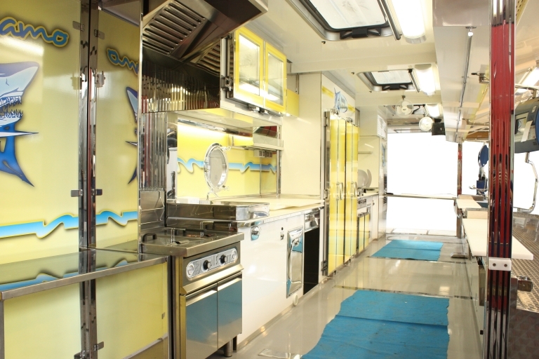 Réalisation camion magasin extensible license C utilisé comme poissonnerie pour poisson cru et cuit.